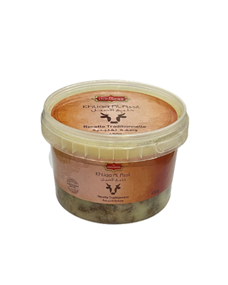 Le khlii Traditionnel LES DOMAINES est une véritable gourmandise, fabriqué avec soin à base de notre viande de bœuf sans soja, marinée dans des épices naturelles et séchée à l'air frais. Son mariage parfait entre tendresse, arômes riches et notes épicées en fait un incontournable de la cuisine marocaine.