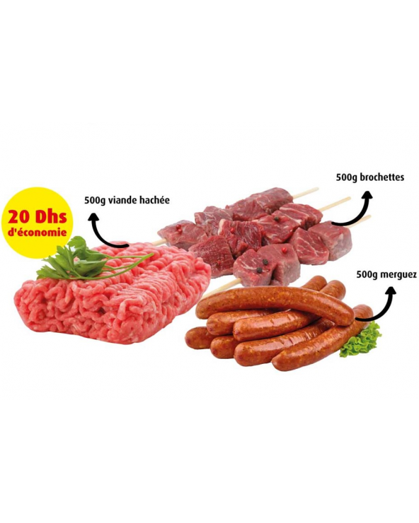 -19,55 Dhs Pack Barbecue / (1.5 Kg) 1,5 Kg de viande de bœuf taurillon - Sans soja 500g de viande hachée 500g de merguez 500g de brochettes 219,50 Dhs 199,95 Dhs