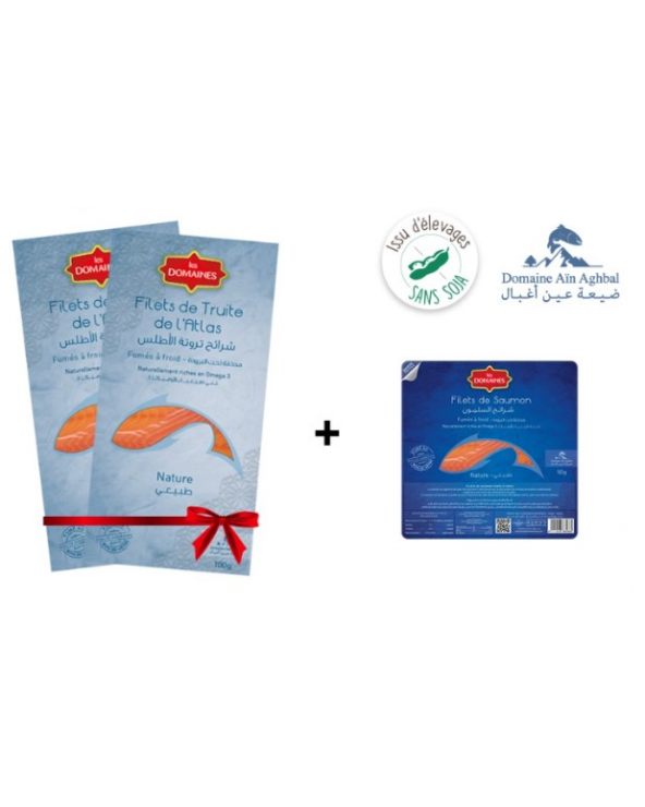 -45,00 Dhs Pack poissons fumés / (250g) 2*100g de truite fumée nature 50g de saumon fumé nature OFFERTS 154,95 Dhs 109,95 Dhs