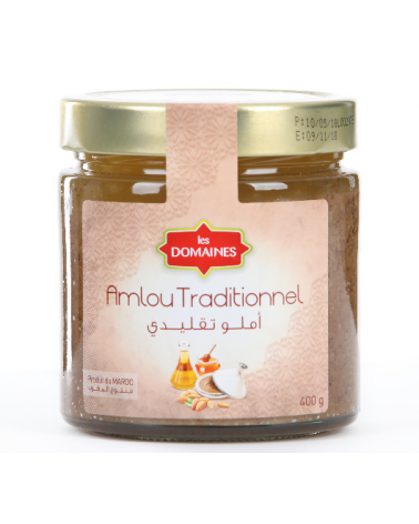 Amlou traditionnel LES DOMAINES est une recette berbère 100% naturelle, préparée selon les méthodes ancestrales avec nos propres amandes cultivées sans résidus ni glyphosate. Contenant notre huile d'argan bio et notre miel pur, notre amlou est d'une qualité exceptionnelle. Sa texture crémeuse et son goût unique permet de ravir les amateurs de saveurs traditionnelles.