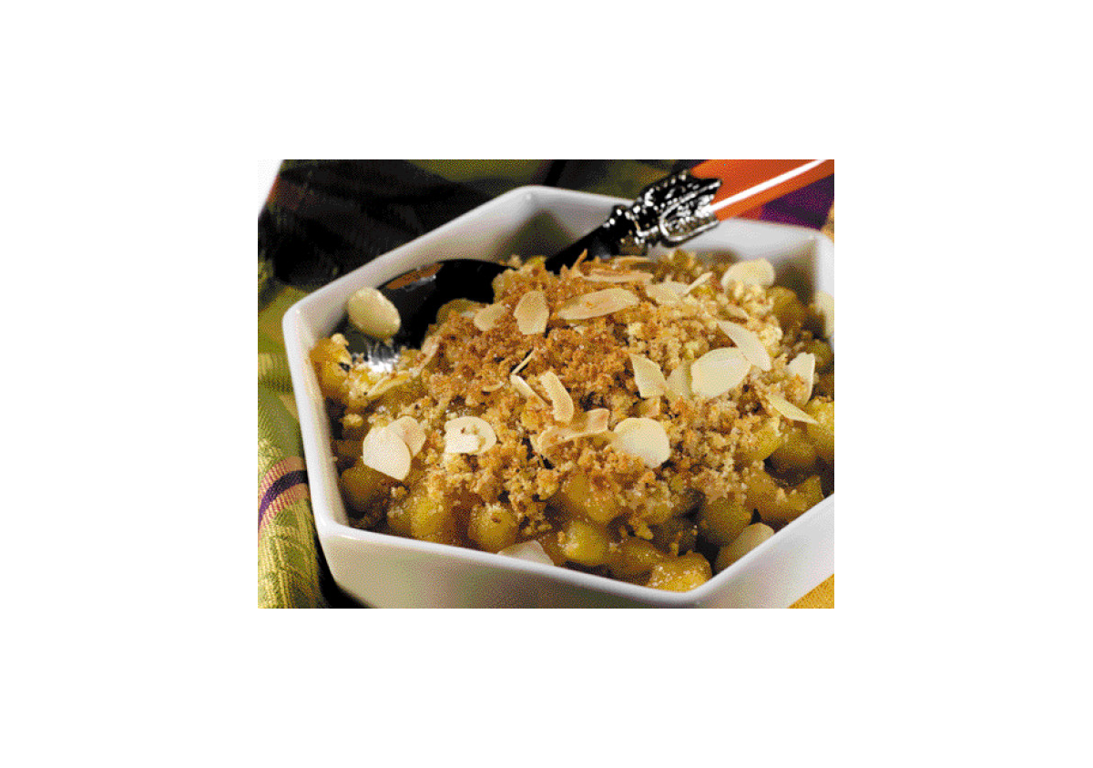 Pour la pâte à crumble : 20 g d’amandes concassées ❖ 20 g d’amandes effilées ❖ 30 g de beurre ❖ 60 g de biscuits moulus ❖ 40 g de sucre semoule ❖ 2 c. à soupe d’eau de fleurs d’oranger.